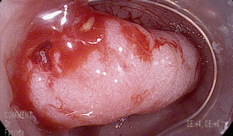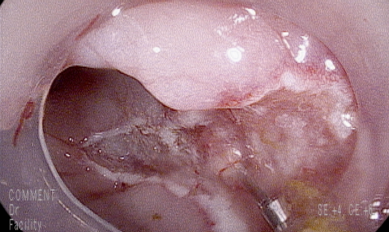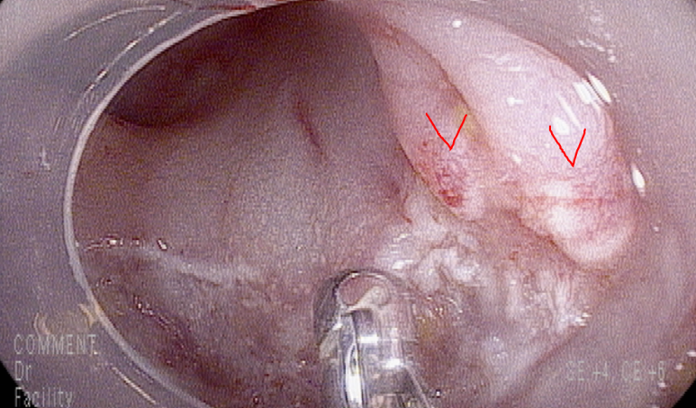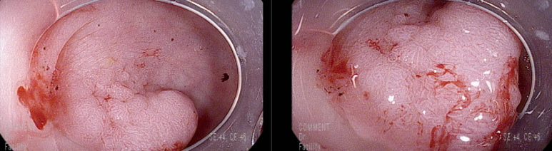 오른쪽 일부분은 스네어로 잡히지 않아 조직겸자로 제거함, 경계 양성 가능성 있으며 양성 종양일 경우 추적검사시 추가적 제거 계획