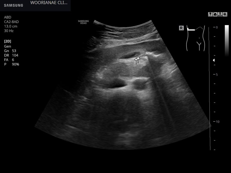 담즙이 역류해 있으니 초음파 하라고... 담낭벽이 부었고 모래가 있다? 간종괴에 대해 삼중시기 (3 phase) CT를 찍으라고...