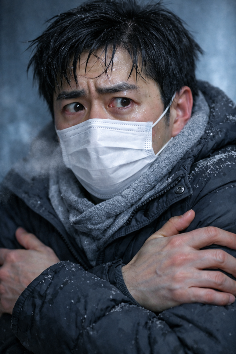 마스크를 끼고 있으나 노출된 얼굴에서 !!! 눈빛이 흔들리는 듯한 관찰 소견 !!! 오한을 심하게 느끼는 듯