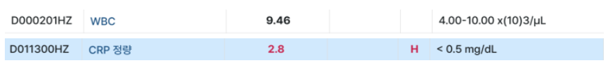 백혈구는 정상 범주이나 상한선에 가깝고, crp는 약 6배 상승