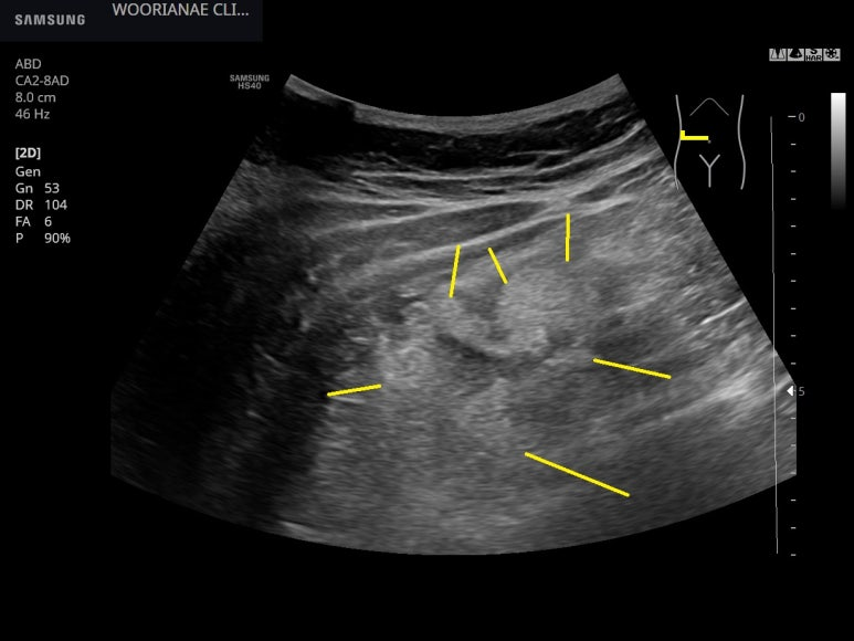 압통의 범위가 하복부까지 넓은것이 인지되며, 민간한 반발압통도 있다. 면적이나 반응에서 중등도를 반영한다고 생각됨