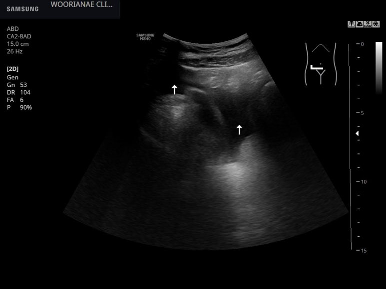담낭의 벽에 부종이 있다. 결론적으로 복수가 차는 현상과 같이 보았을때 혈액의 총단백/알부민 수치가 떨어져 있을 것이다. 3개월전과 달리