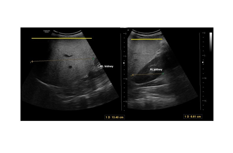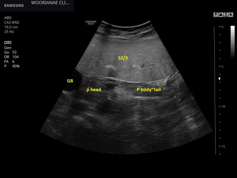 프로브로 눌러보았을때 담낭 자체보다는 liver에 대한 전반적 압통임을 확인할수 있음.