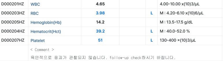 백혈구, 혈색소는 괜찮으나 혈소판만 5만정도