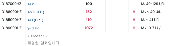 알콜성 간염 패턴, AST/ALT가 일천 이상이지 않을까 하였으나 매우 높지는 않았다.