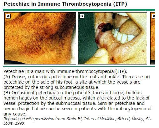 응고장애 일때는 주로 크게 번지고 만져지는 자반 형태, 관절로 출혈시 hemarthrosis (혈관절)