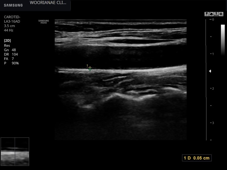 경동맥 내막이 0.1 cm 이상으로 두꺼워져 있다.