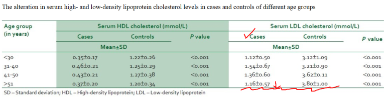 간경화 환자에서 고지혈수치에 대한 보고, 간내 합성 저하에 따라 점차 감소한다.