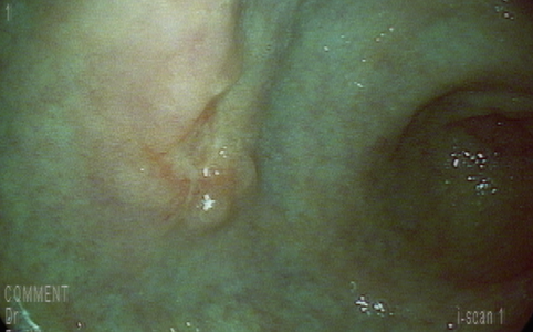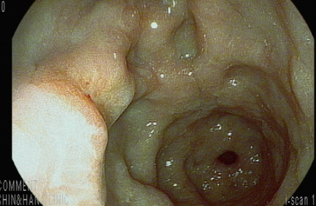 2016년 위내시경; 중심부 미란의 범위와 전체적인 크가가 증가함. 조기위암 IIa+IIc 모양